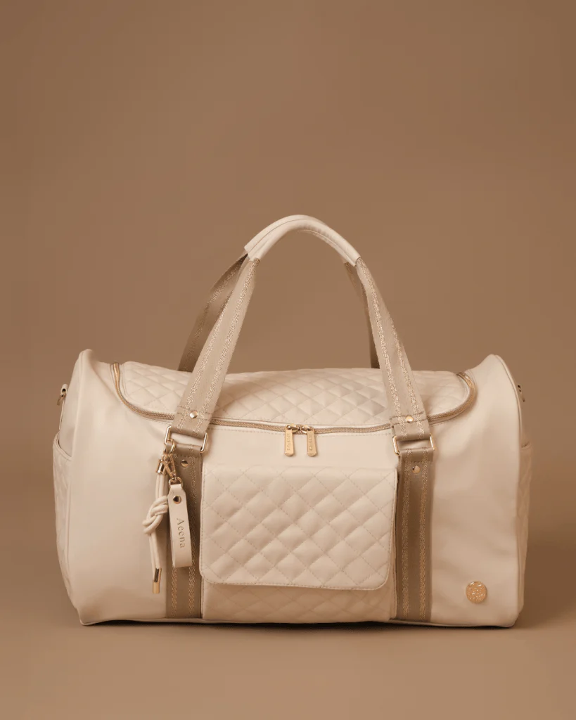 The bag has multiple compartments, including bottle pockets and several zip pockets for organization.